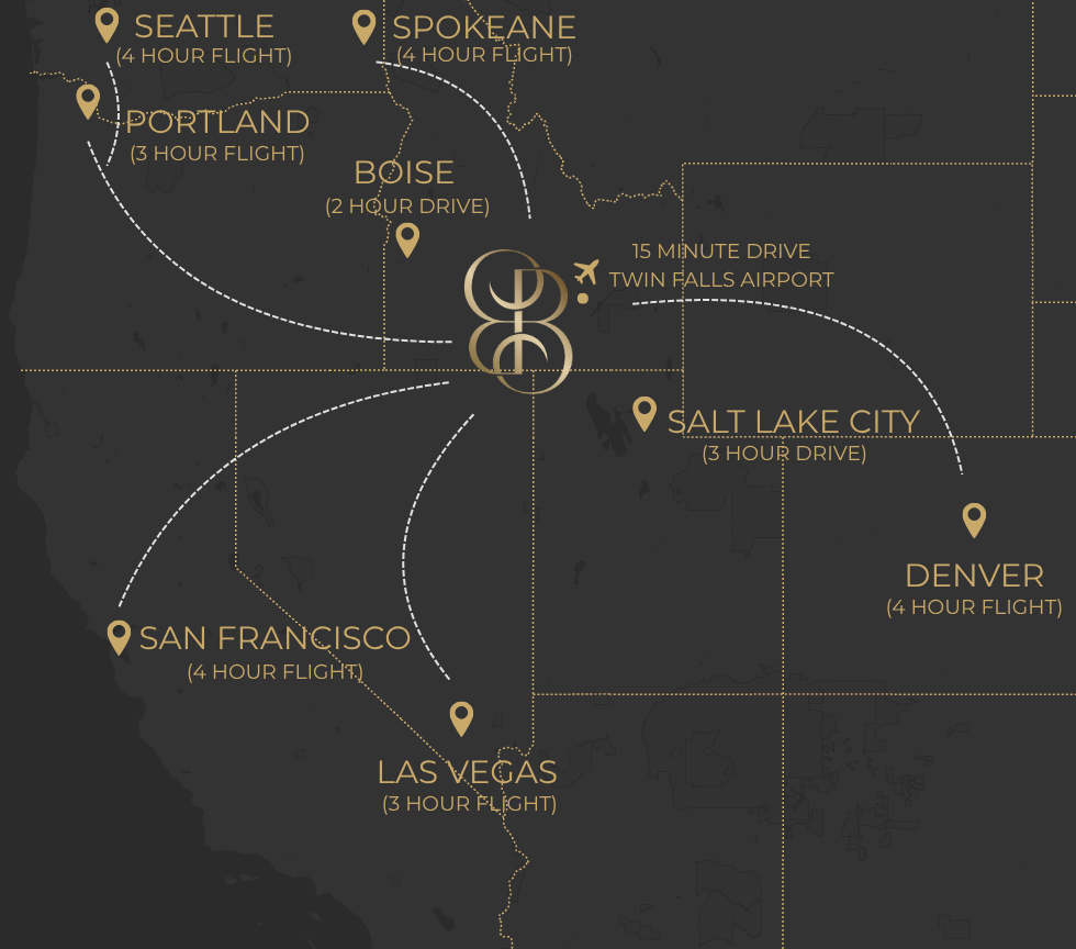 Twin Falls Airport is only 15 mins away, Boise Airport is a 2 hour drive, and Salt Lake City International Airport is 3 hours by car.